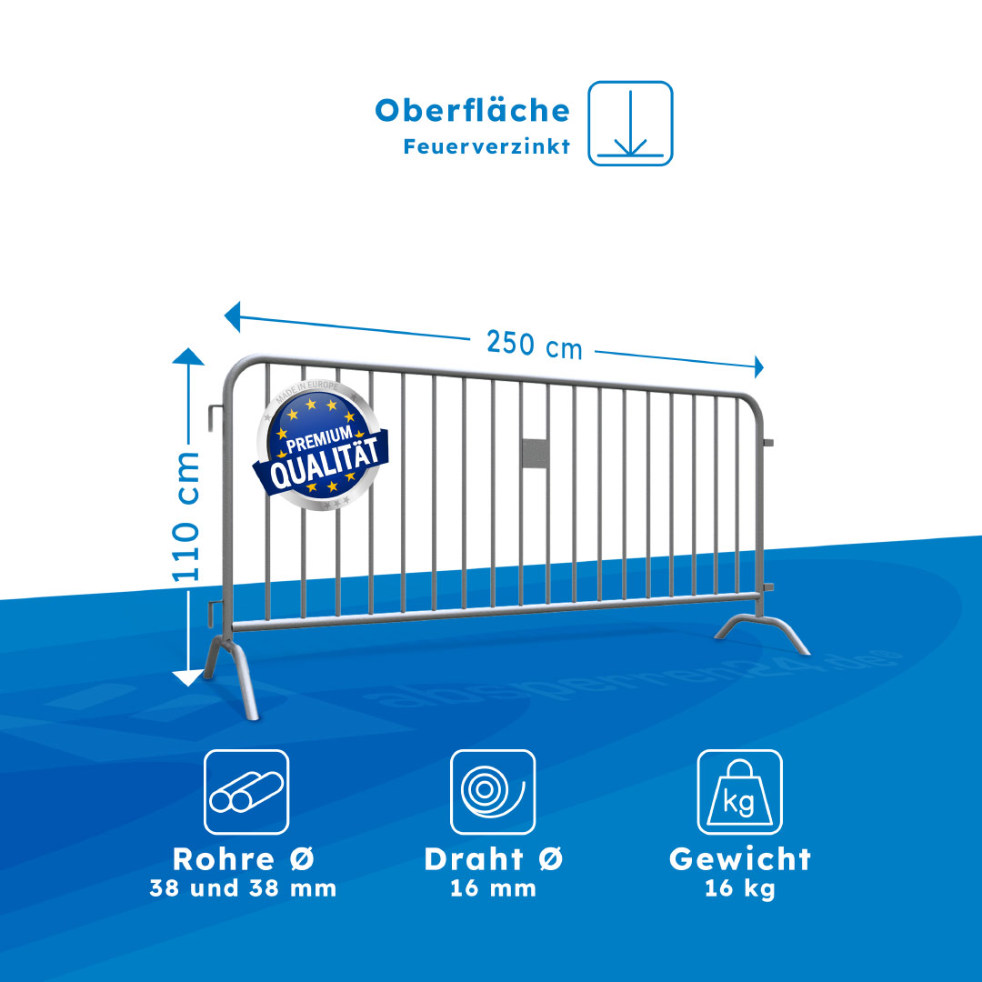 Mannesmanngitter – auch Mannheimer Gitter und seltener Luxemburger Gitter, Demogitter oder Personengitter genannt – sind für die Führung und Abgrenzung „ruhiger“ Menschenmassen ideal. Bei hohem Personendruck sollten Sie besser Polizeigitter / Hamburger Gitter als Absperrsysteme einsetzen.